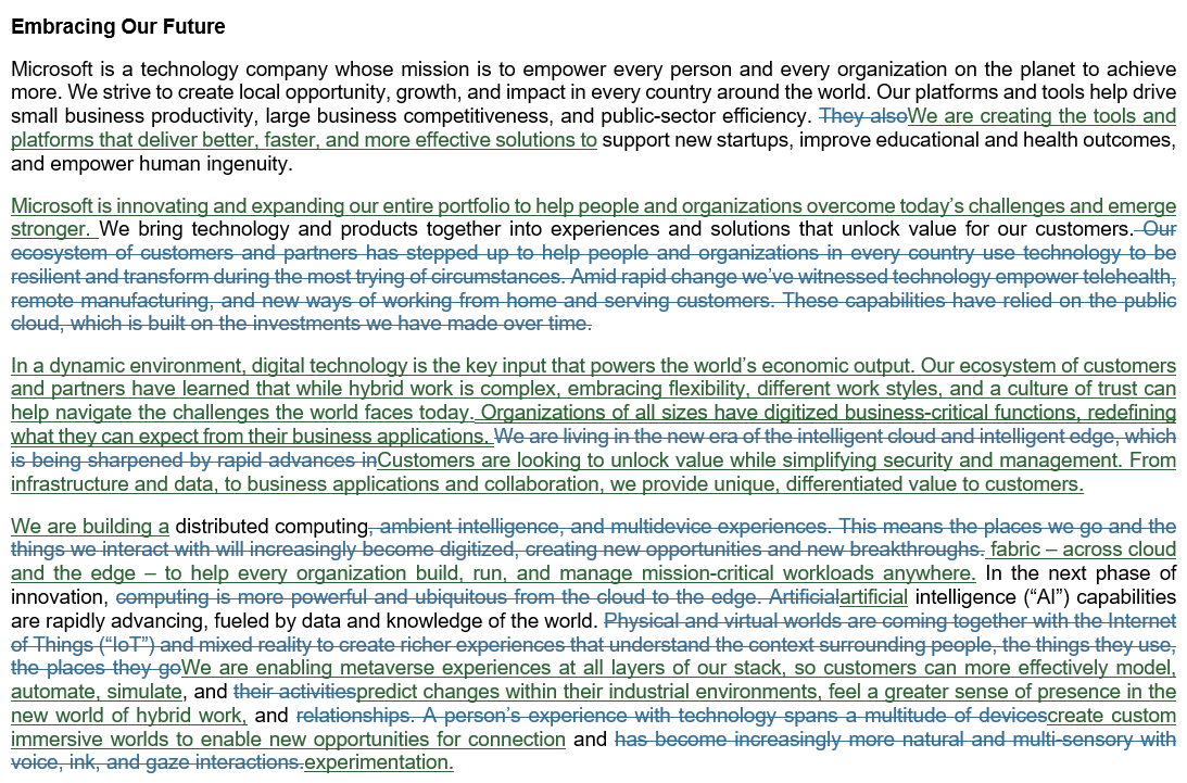 Függetlenül attól, hogy a Microsoft vezérigazgatója, Satya Nadella gyötrődik minden vessző miatt, az évenkénti módosítások és kiegészítések egyértelművé teszik, hogy a vállalaton belül bizonyos emberek alaposan megfontolják ezeket a szavakat. Ily módon betekintést nyújtanak a vállalat gondolkodásmódjába és az iparág helyzetébe.